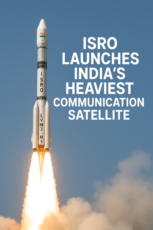 India’s space programme reached another historic milestone as ISRO’s LVM3-M5 rocket lifted off successfully from Sriharikota, carrying the country’s heaviest communication satellite, CMS-03, weighing over 4,400 kg. Known as “Bahubali” for its immense power, the Launch Vehicle Mark-3 placed the satellite into a geosynchronous transfer orbit, ensuring expanded multi-band coverage across India and nearby oceanic regions. The CMS-03 satellite is expected to significantly boost strategic and civilian communication, particularly enhancing connectivity for the Indian Navy. This successful mission reinforces India’s self-reliance in space technology and showcases ISRO’s growing capability in heavy-lift satellite launches.